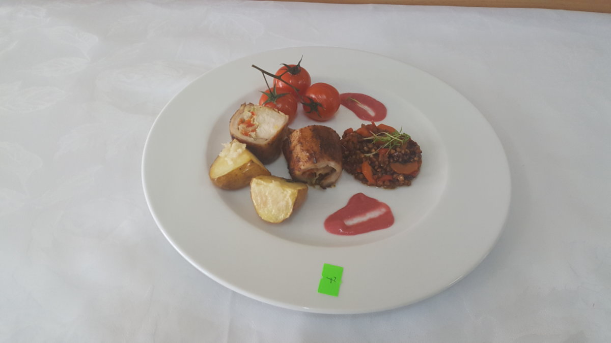 Wioleta Sobolak przygotowała: Danie główne: Roladki z królika z farszem selerowo paprykowym , podane z prażoną kaszą z warzywami z sosem malinowo gruszkowym, konfitowanymi ziemniakami oraz pieczonymi pomidorkami.
