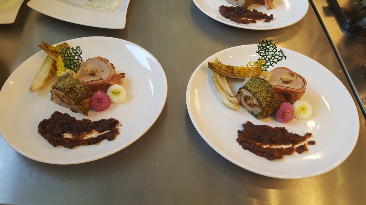 Danie zasadnicze: Polędwiczka wieprzowa nadziewana otulona boczkiem, w kruszonce ziołowej , podana z puree fasolowym z alla czatnej śliwkowo jabłkowym i grillowaną cykorią.