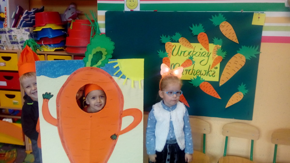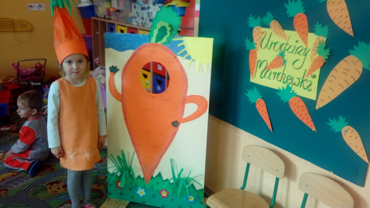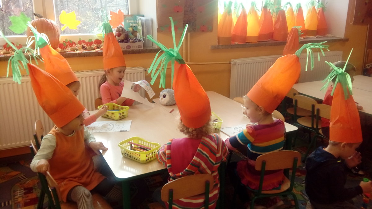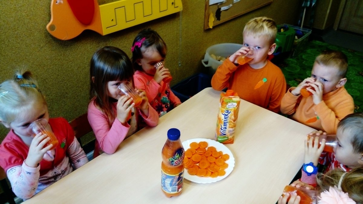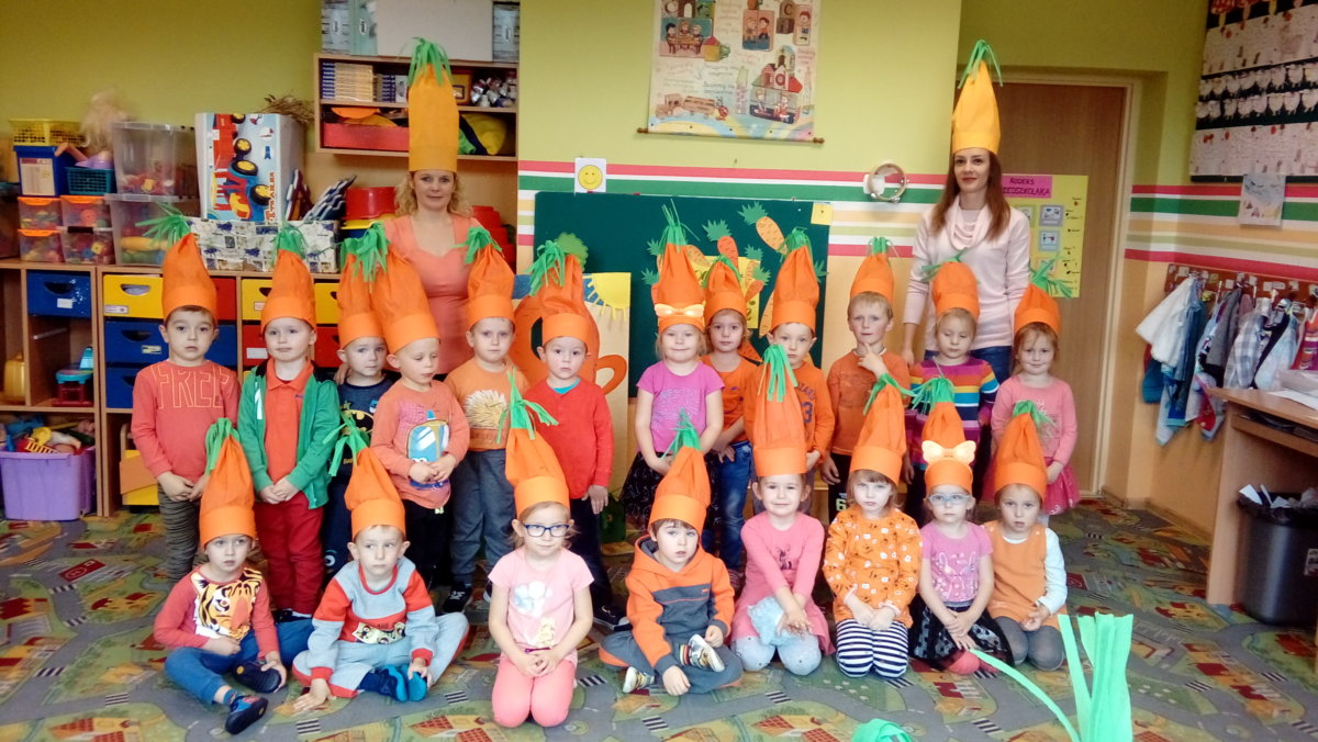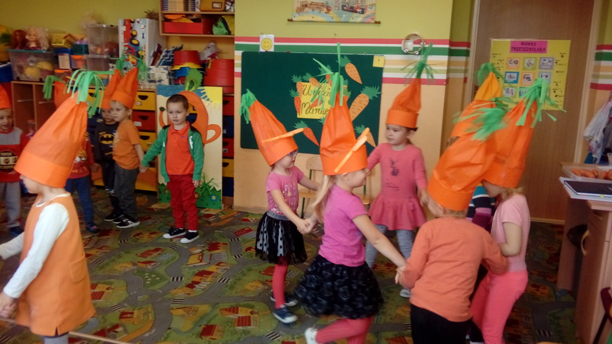 „Na marchewki urodziny wszystkie zeszły się jarzyny a marchewka gości wita o zdrowie grzecznie pyta”. To właśnie marchewka jest warzywem, które zawiera niezbędne dla zdrowia witaminy. Aby zachęcić dzieci do spożywania marchewki zorganizowaliśmy w przedszkolu Urodziny Marchewki. W tym dniu dzieci ubrały się na pomarańczowo, każde otrzymało opaskę z tym warzywem. Przedszkolaki brały udział w zabawach muzycznych, ruchowych i plastycznych z marchewką w roli głównej. Było picie soku, jedzenie surówki i chrupanie surowej marchewki. Po takiej dawce witamin, śmiechu i zabawy nasze przedszkolaki będą na pewno zdrowe.