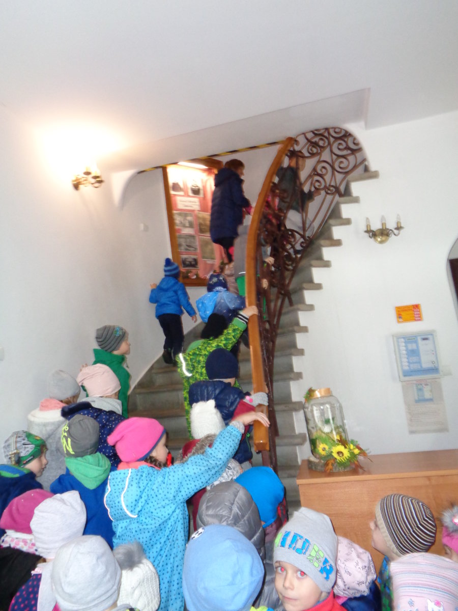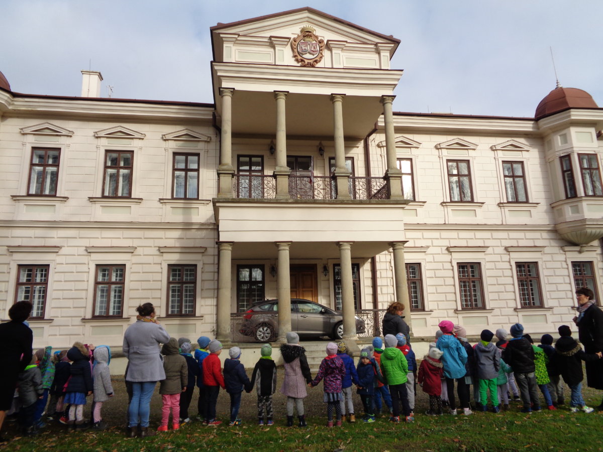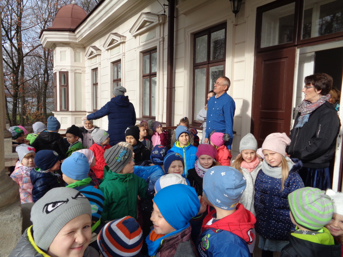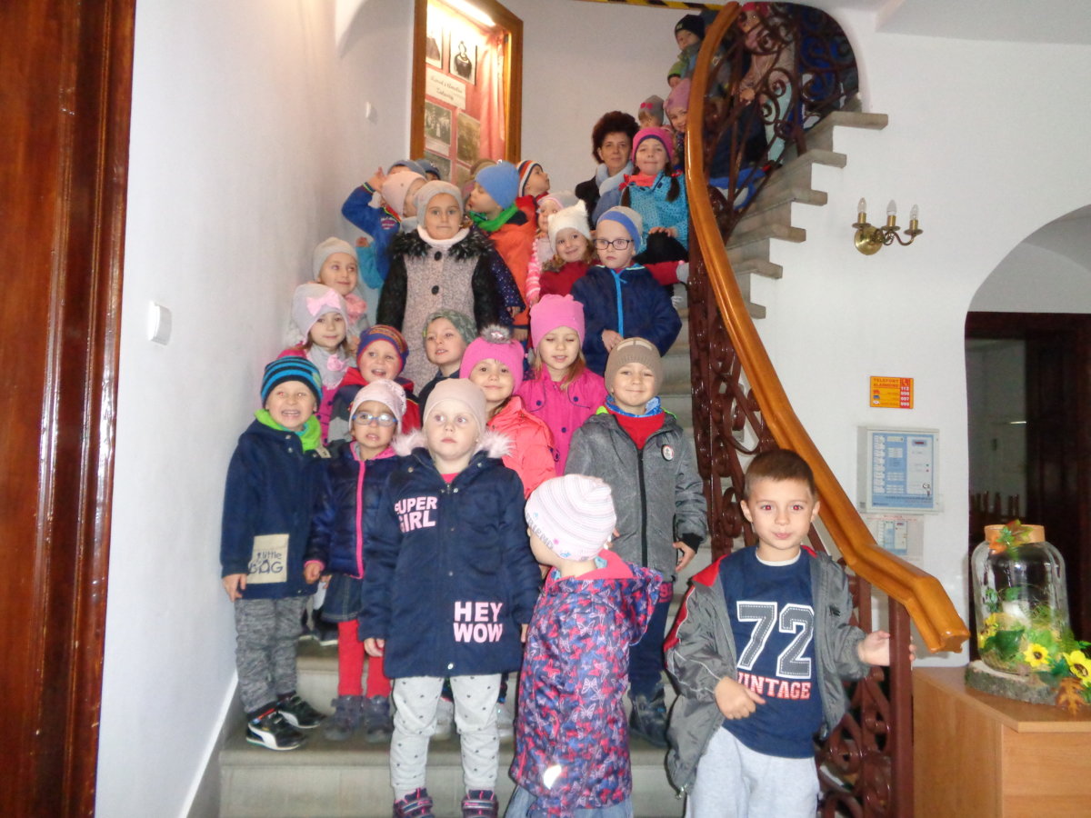 14 listopada wybraliśmy się na wycieczkę do znajdującego się niedaleko przedszkola Pałacu Załuskich z XIX w. Dzieci poznały herb oraz historię hrabiego Karola i jego małżonki Amelii. Przedszkolaki oglądały piękne pałacowe sale. Dużą atrakcją były wysokie kręcone schody, które stanowiły nie lada wyzwanie szczególnie dla maluchów. Zwiedziliśmy też oranżerię, zobaczyliśmy zabytkowy zegar słoneczny i zbór ariański zamieniony na spichlerz. Zadowoleni i zmęczeni wróciliśmy na obiad.