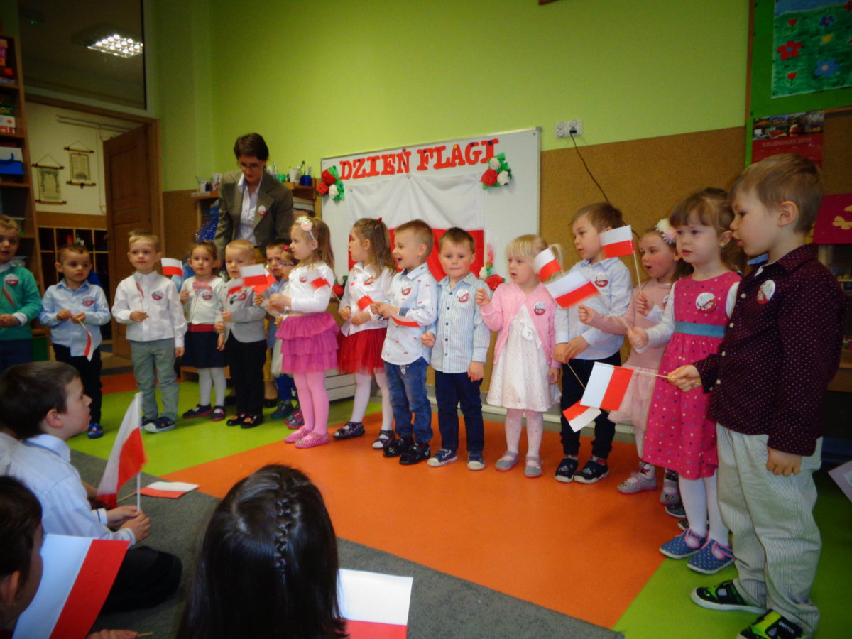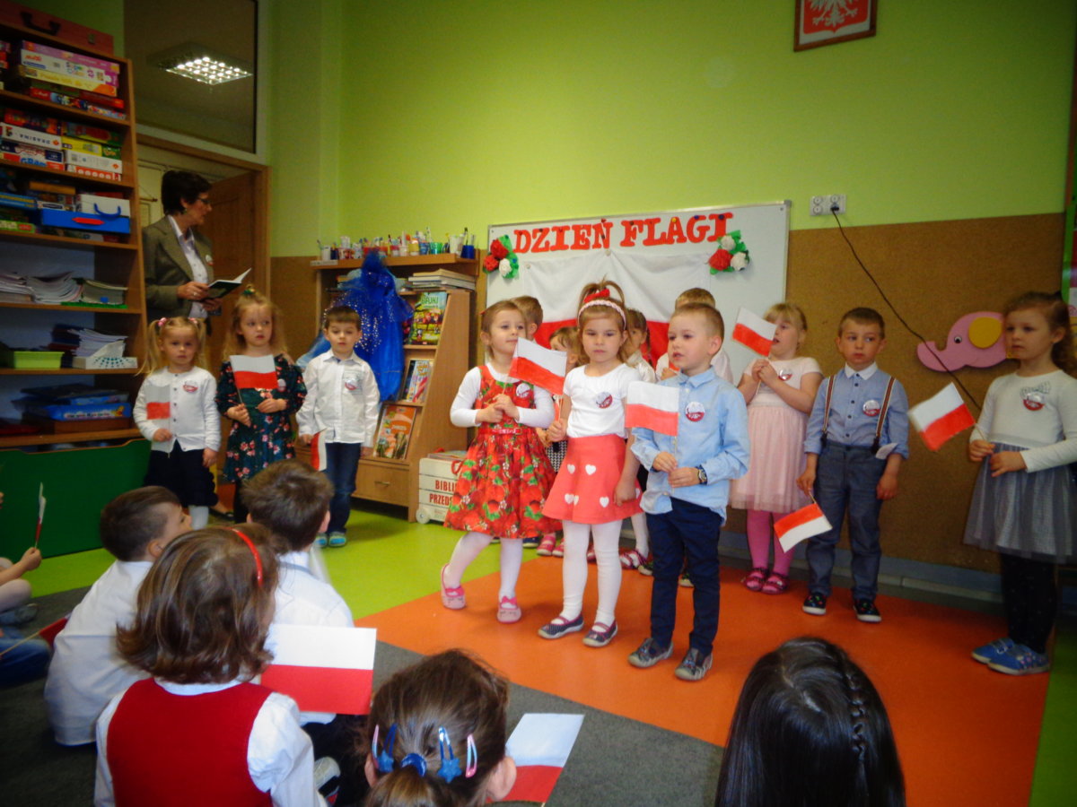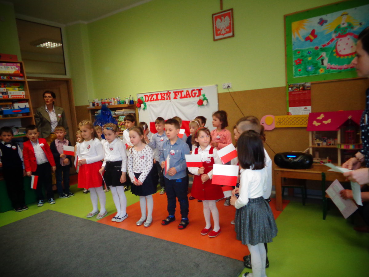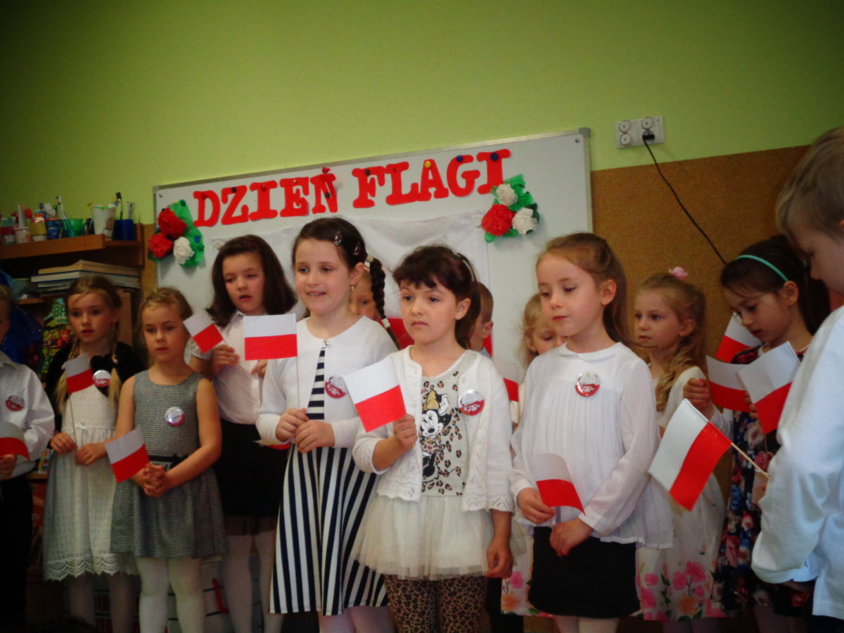 Budząc zainteresowania dzieci wydarzeniami ogólnopaństwowymi, a także rozwijając poczucie przynależności narodowej wzięliśmy udział w obchodach Święta Flagi. Był to czas na przypomnienie dzieciom historii państwa polskiego, rozmowy na temat symboli narodowych: flagi, godła, hymnu. Tego dnia przedszkolacy wspaniale prezentowali się w strojach galowych. Chętnie wykonywali prace plastyczno- techniczne wśród, których nie mogło zabraknąć chorągiewek. Recytowali wiersz Czesława Janczarskiego „Barwy ojczyste”, odśpiewali z powagą i w pozycji na baczność Mazurek Dąbrowskiego. Dzień ten był dla przedszkolaków wspaniałą lekcją przypomnienia sobie, że są Polakami, a Polska to ich Ojczyzna.