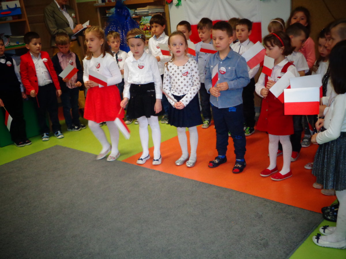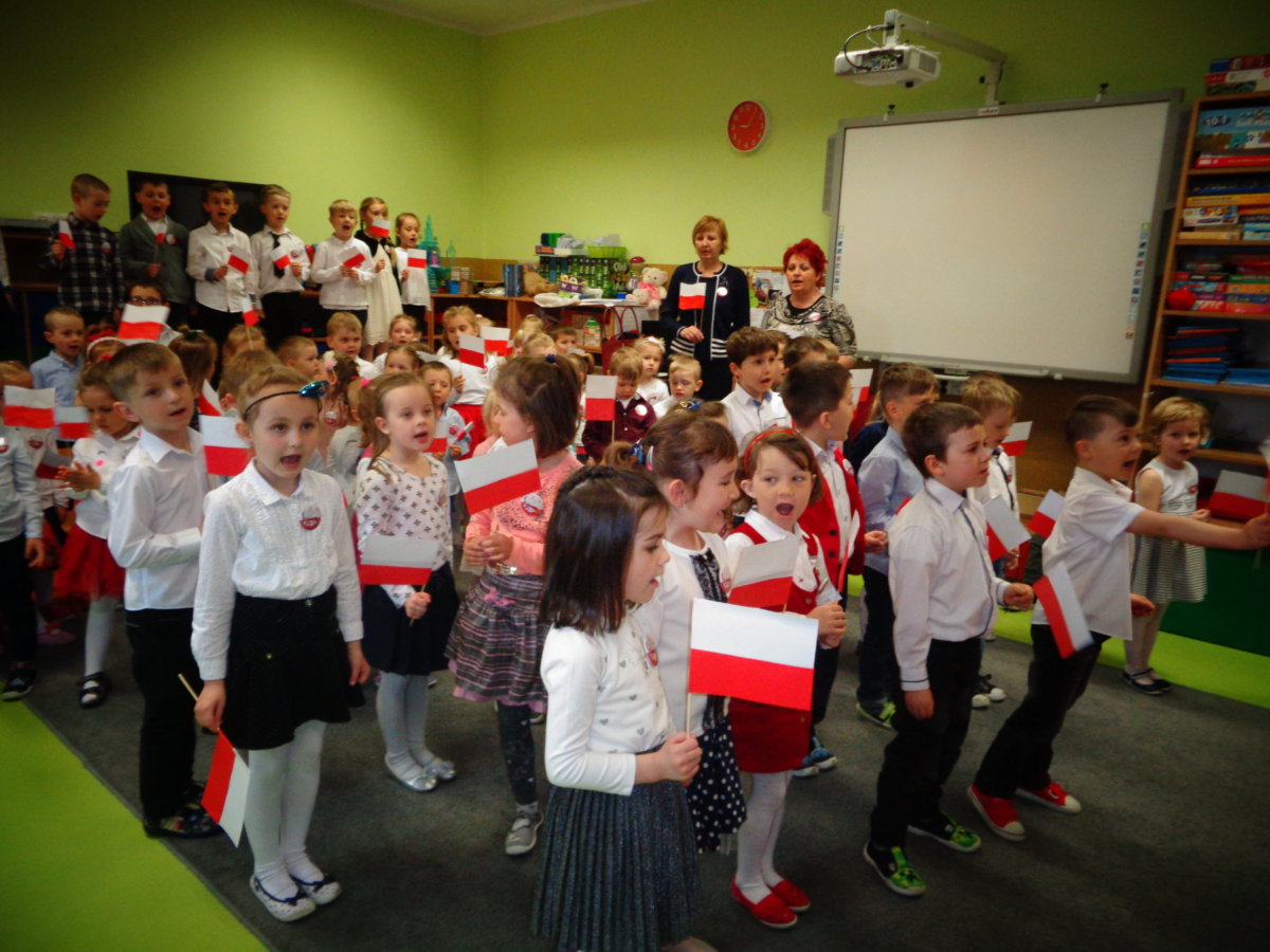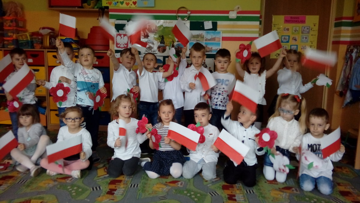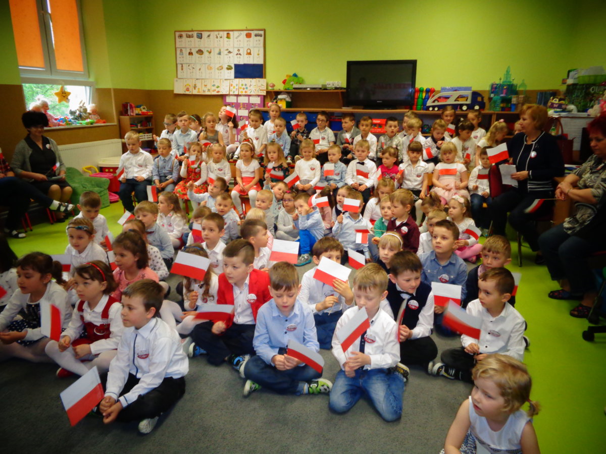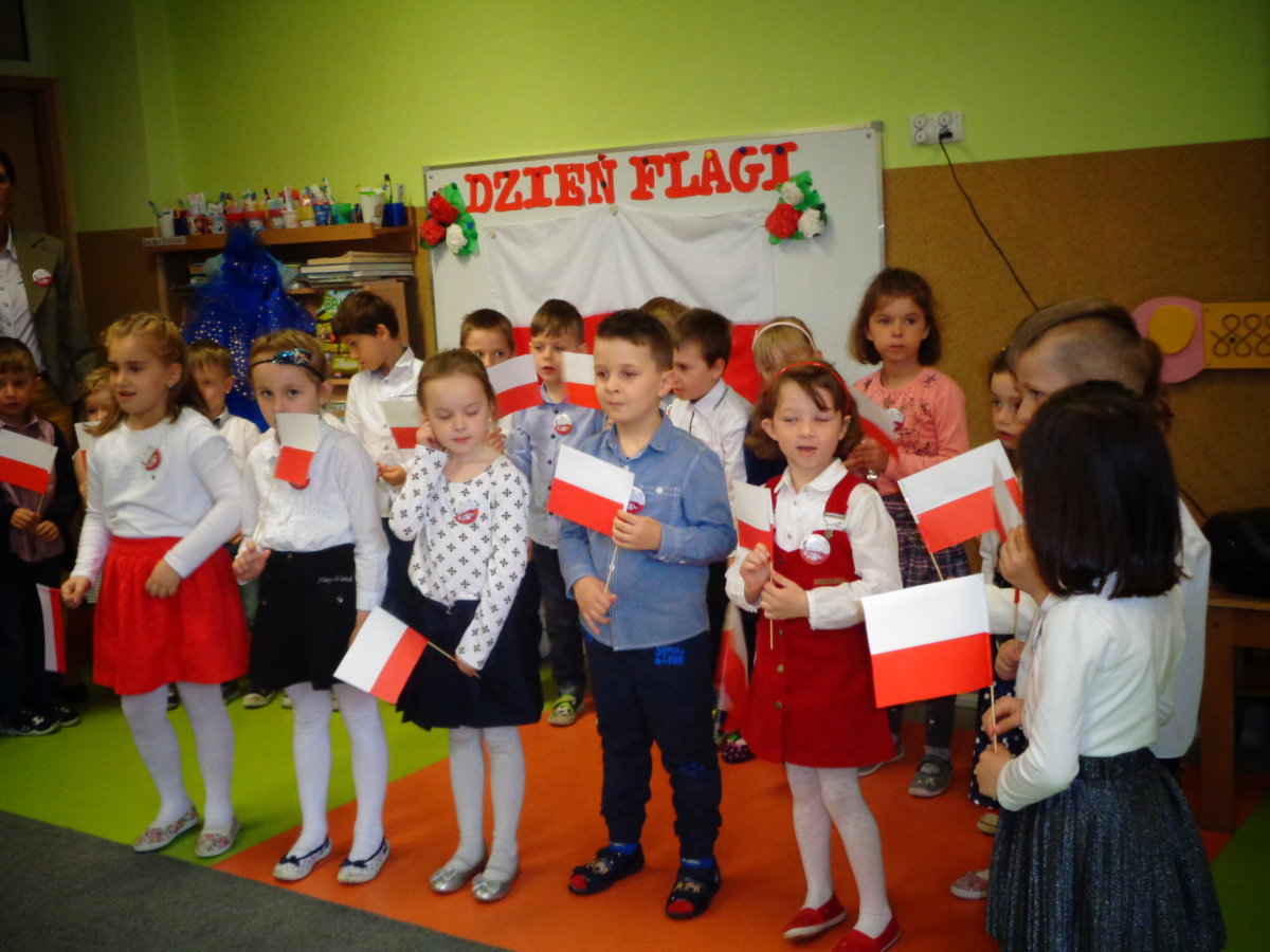 Budząc zainteresowania dzieci wydarzeniami ogólnopaństwowymi, a także rozwijając poczucie przynależności narodowej wzięliśmy udział w obchodach Święta Flagi. Był to czas na przypomnienie dzieciom historii państwa polskiego, rozmowy na temat symboli narodowych: flagi, godła, hymnu. Tego dnia przedszkolacy wspaniale prezentowali się w strojach galowych. Chętnie wykonywali prace plastyczno- techniczne wśród, których nie mogło zabraknąć chorągiewek. Recytowali wiersz Czesława Janczarskiego „Barwy ojczyste”, odśpiewali z powagą i w pozycji na baczność Mazurek Dąbrowskiego. Dzień ten był dla przedszkolaków wspaniałą lekcją przypomnienia sobie, że są Polakami, a Polska to ich Ojczyzna.