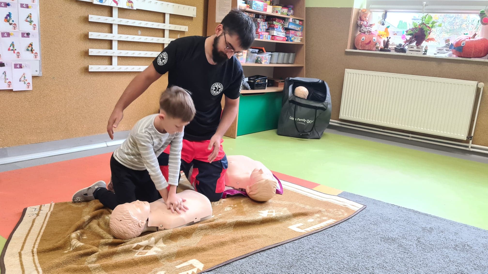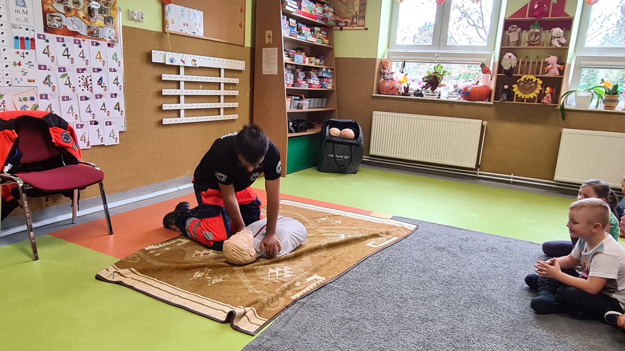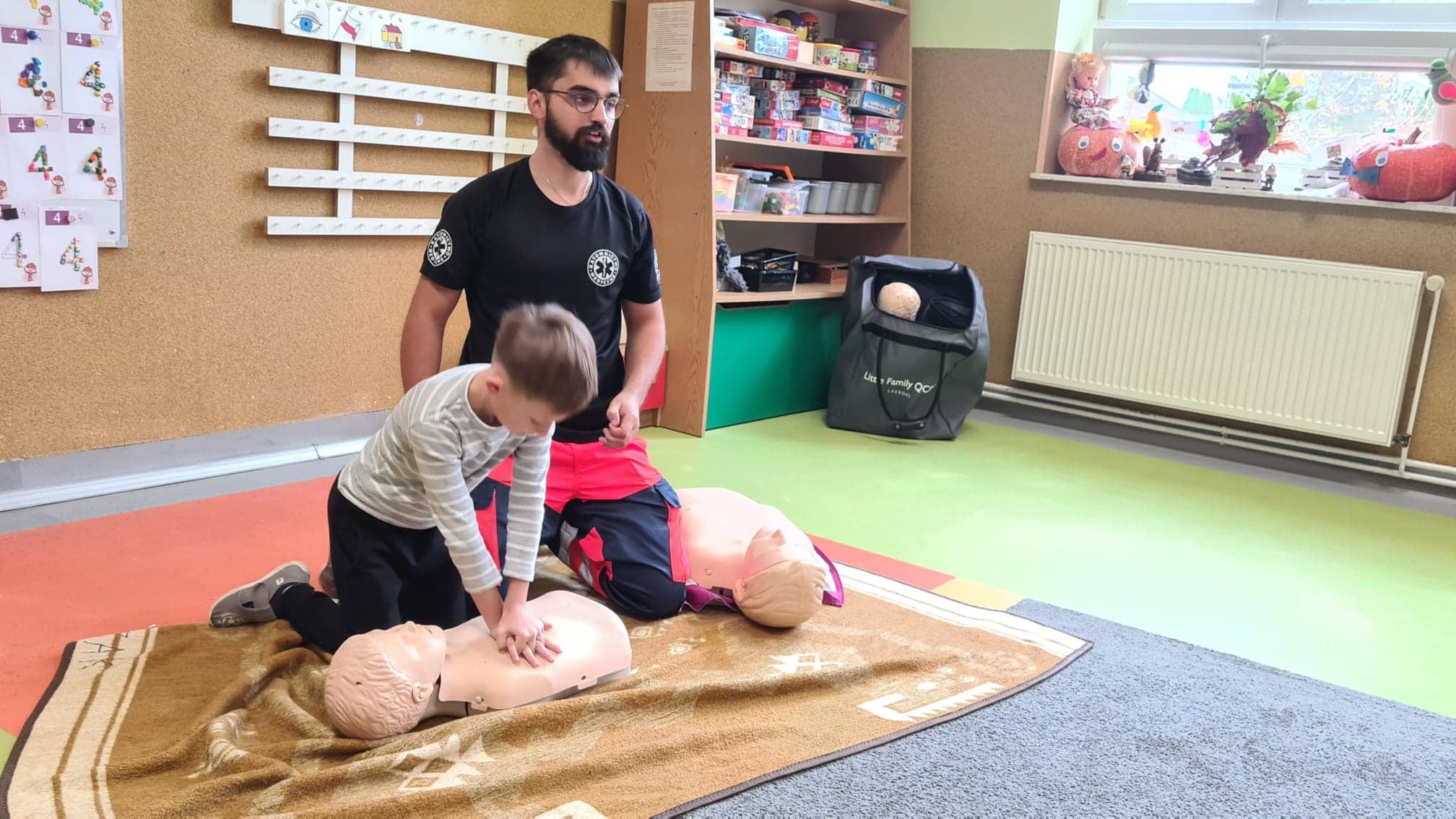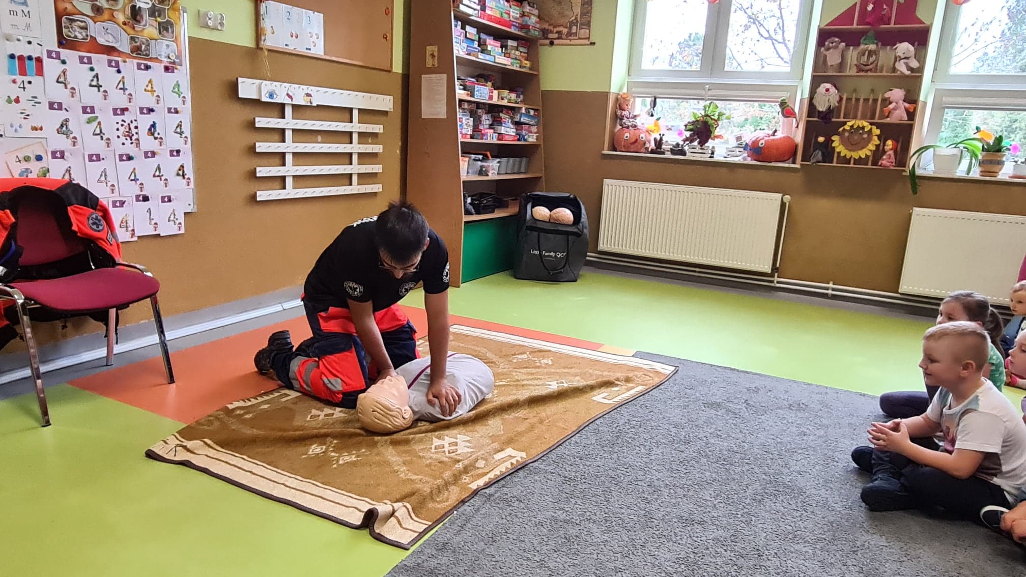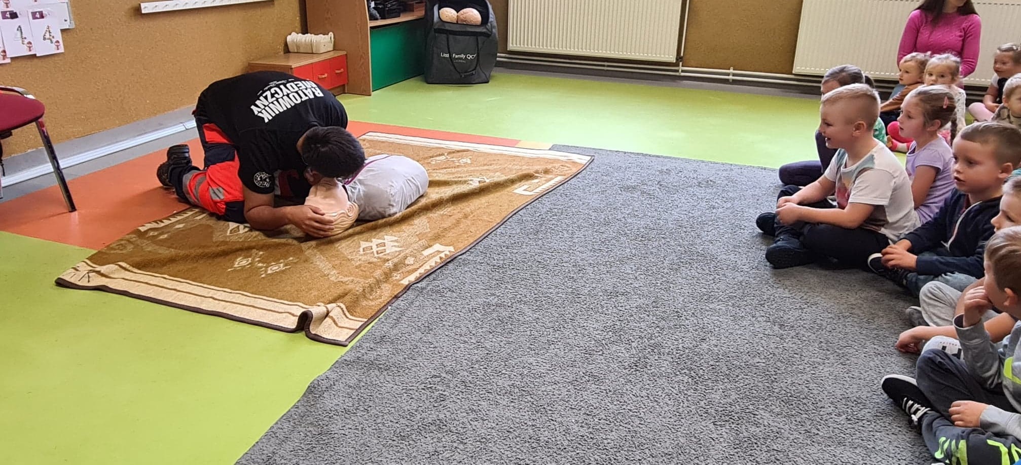 Podczas spotkania przedszkolaki zapoznały się z pracą ratownika, przypomniały zasady udzielania pierwszej pomocy oraz miały możliwość udzielić pomocy osobie w potrzebie na przykładzie fantoma.