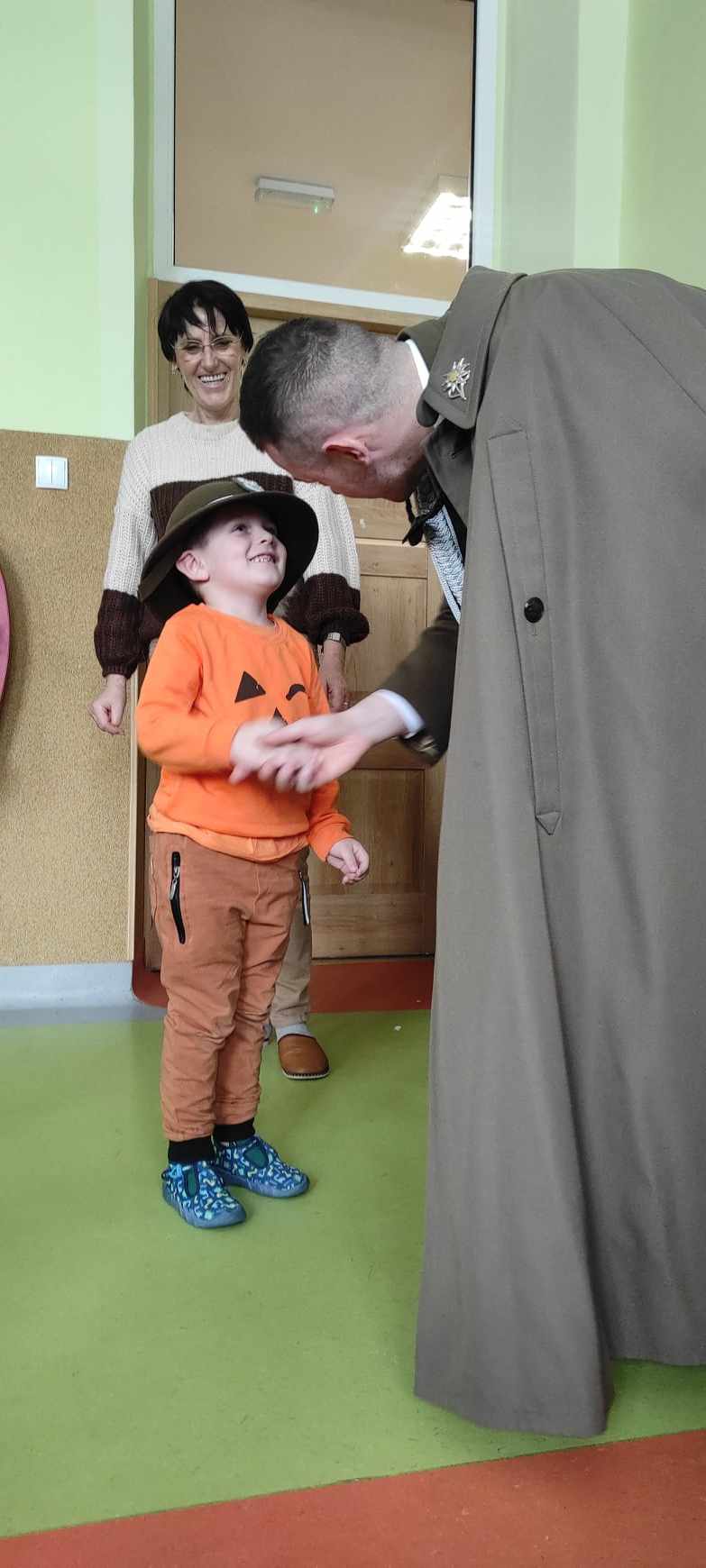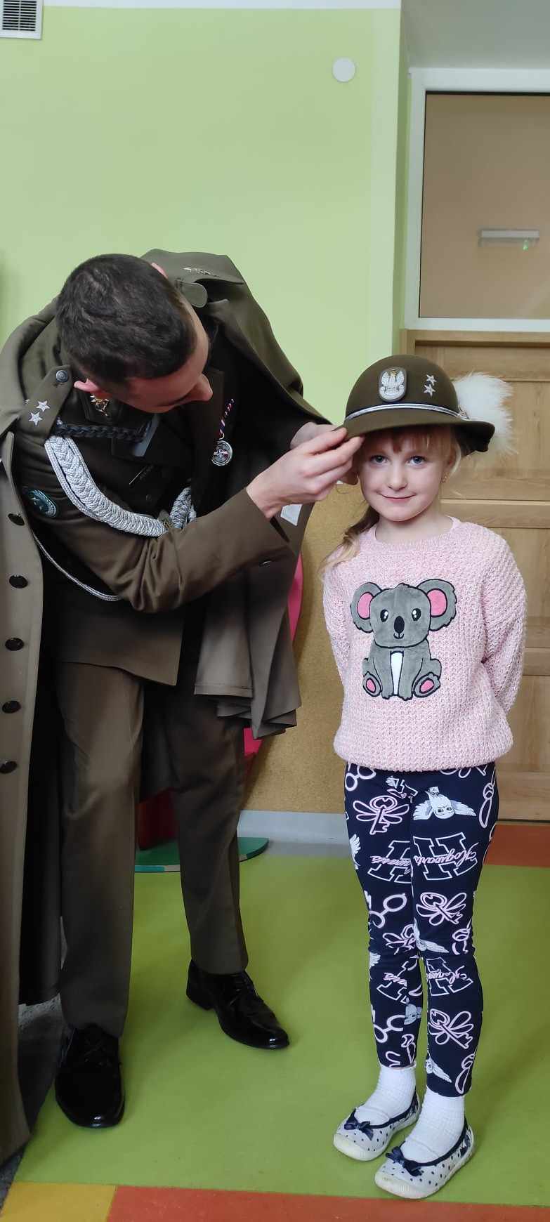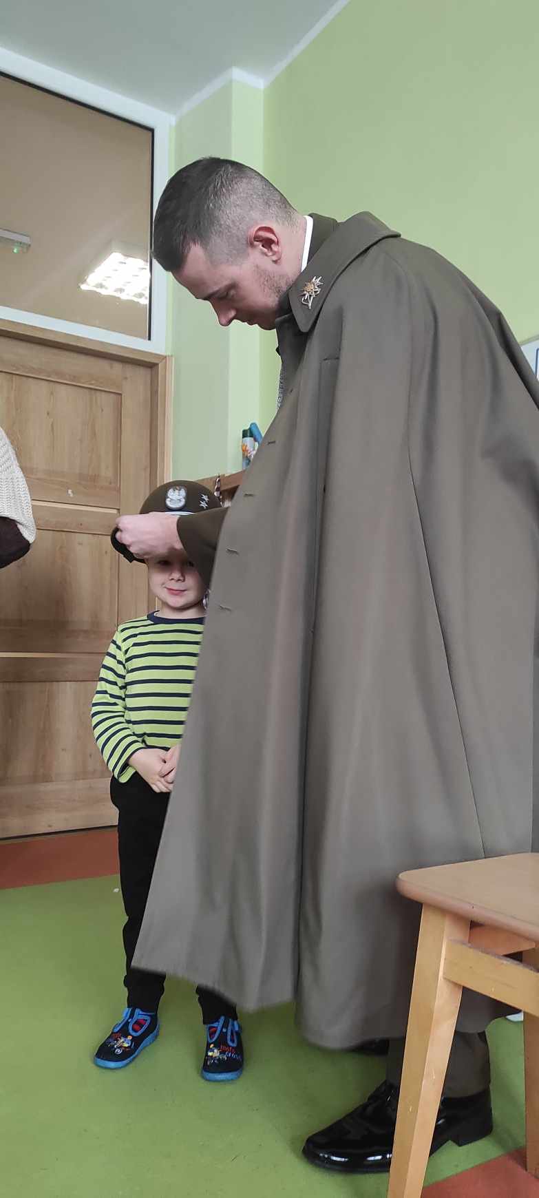 Poznaliśmy charakterystykę służby żołnierskiej, codzienne obowiązki żołnierza. Żołnierz zaprezentował wojskowy mundur galowy, zapoznał dzieci emblematami i symbolami narodowymi. Dzieci wysłuchały Legendy o powstaniu państwa polskiego.